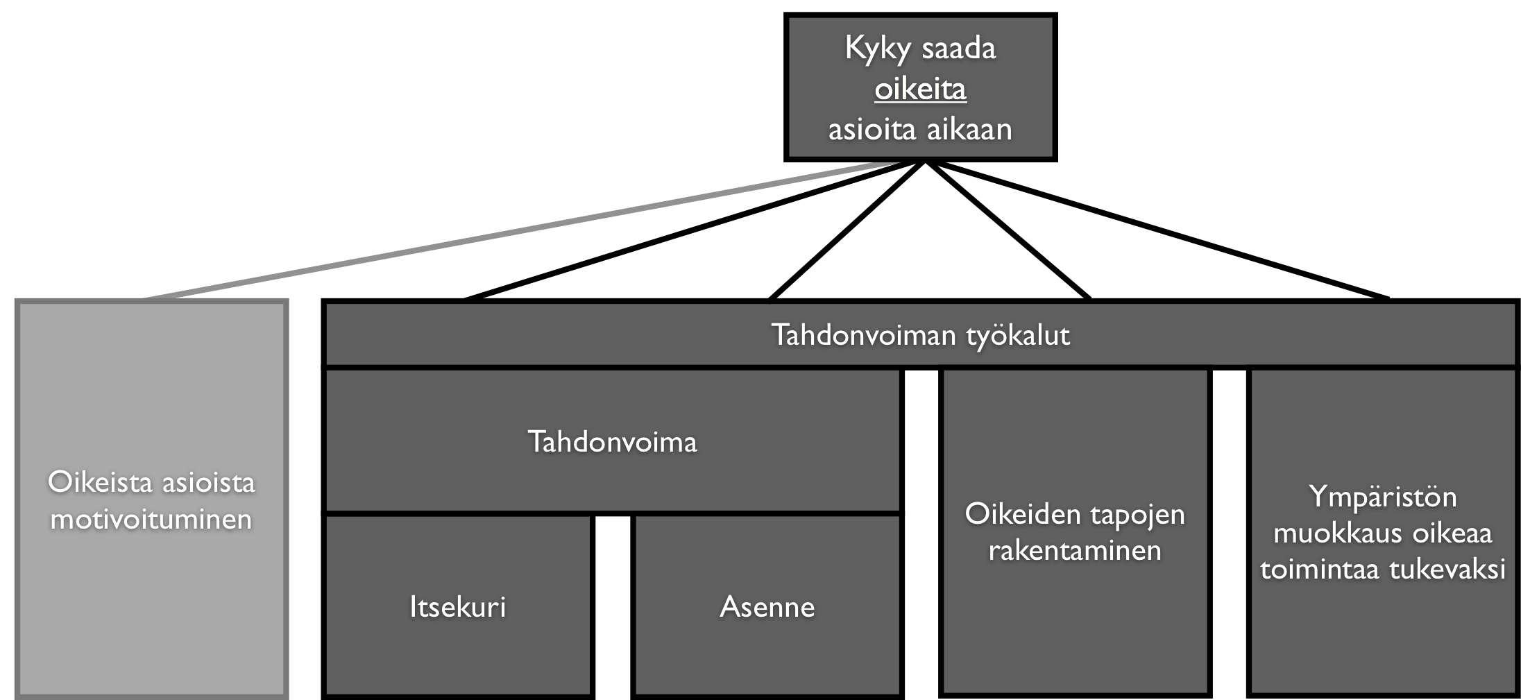 Mutta olennaista on ymmärtää, että kun päämääränä on oikeiden asioiden tekeminen, tahdonvoima ei suinkaan ole ainoa aseemme. Ja hyvä niin, sillä tahdonvoimamme kuluu nopeasti käytössä eikä usein yksinään riitä. Siksi tehokkain tapa vahvistaa tahdonvoimaa on useimmiten keksiä keinoja, joiden ansiosta meidän ei tarvitse alun perinkään sitä käyttää. Näin teet tavoitteestasi sen helpoimman vaihtoehdon. Siksi puhun itse tahdonvoiman sijasta mieluummin tahdonvoiman työkaluista. Itse tahdonvoiman lisäksi työkaluihin kuuluvat oikeiden tapojen rakentaminen sekä ympäristön sopiva muokkaaminen.
